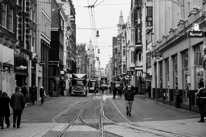 Bij de tram staan twee mensen die in gebrekkig Engels aan de trambestuurder vragen of deze tram ook naar de Dam gaat. De bestuurder doet haar luikje open en geeft netjes, in Amsterdams Engels, een bevestigend antwoord. Ze vragen hoe ze moeten betalen, en opnieuw geeft de bestuurder vriendelijk uitleg dat het met de smartphone kan. Na wat gepruts op hun mobiel houden ze hun telefoon voor het apparaat en lopen verder. Ik kan eindelijk instappen.